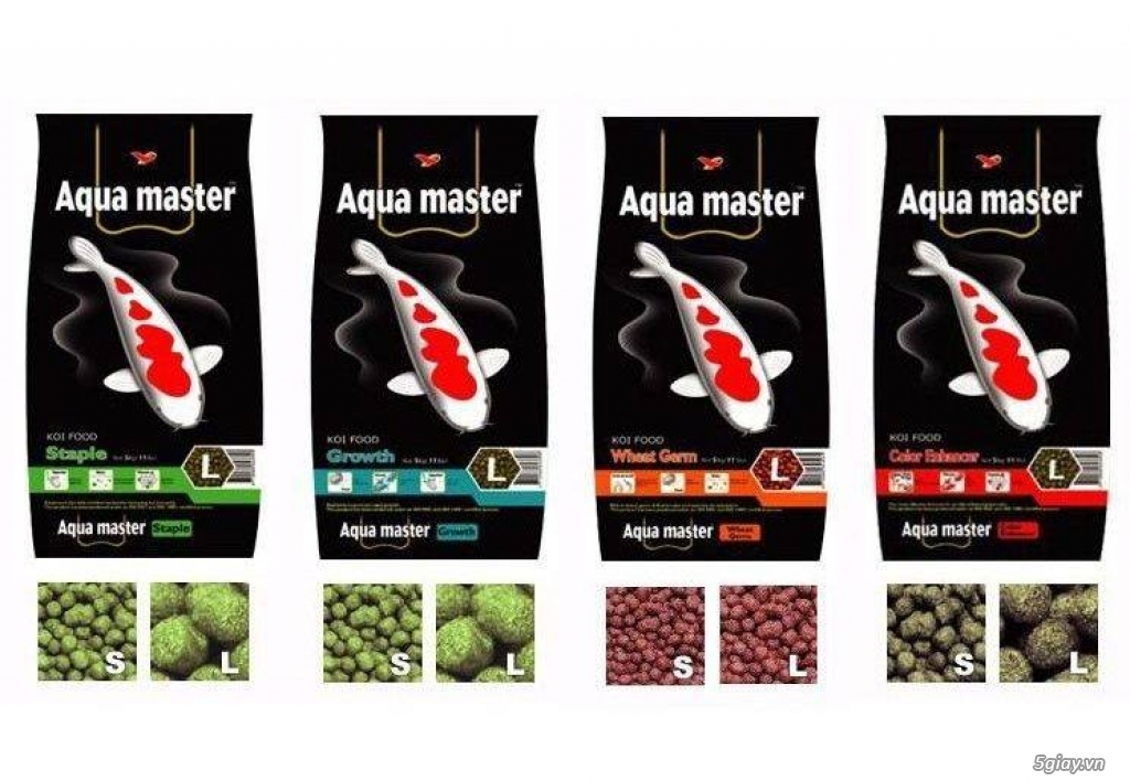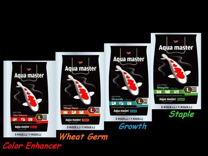 - Theo đúng tiêu chuẩn thức ăn cơ bản dành cho cá koi, Aqua master đưa ra 4 bộ sản phẩm mới bao gồm thức ăn tăng trưởng, thức ăn cho mùa lạnh, thức ăn tăng màu cho cá lớn và thức ăn phổ thông: