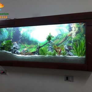 Bể có kích thước chiều dài là 1m68, rộng 17cm, cao 68cm với bề mặt kính là 12mm. Bể được thiết kế khá sáng tạo gồm hệ thống lọc nước, đèn chiếu sáng, đất nền thủy sinh,…bố cục trang trí sinh động. Hơn thế nữa bể còn được ốp mặt bằng gỗ hương với thiết kế vô cùng tinh tế tạo cho gian phòng trở nên sang trọng hơn.