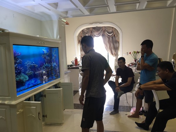 Nhân viên Mạnh Tuấn đang thi công lắp đặt bể nuôi cá rồng Các loại bể cá được Mạnh Tuấn giới thiệu đến quý khách hàng luôn đảm bảo các tiêu chí tốt nhất, cho một môi trường sống khỏe mạnh và sạch sẽ cho loài cá rồng đắt đỏ.