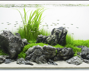Như trong bể cá này, tập chung chính vào cây thủy sinh ở giữa, và đá xếp xung quanh