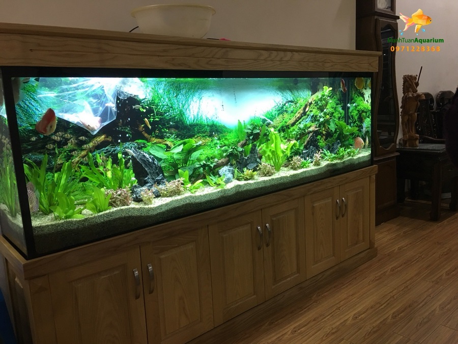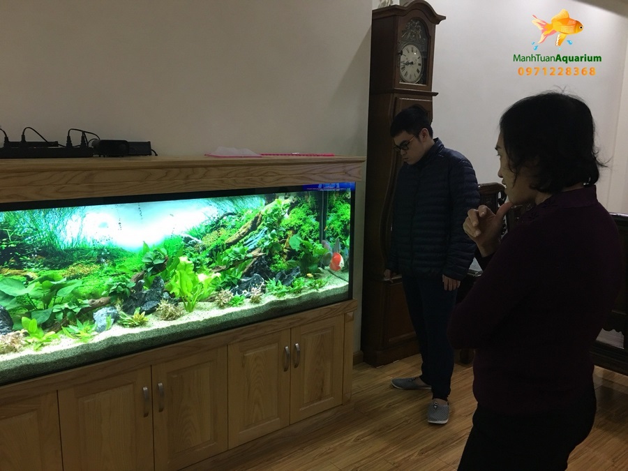 Bể chú long được thiết kế trồng thuỷ sinh cây thật và được cửa hàng Mạnh Tuấn tư vấn số đo kích thước phong thuỷ trước khi lắp đặt và thi công.