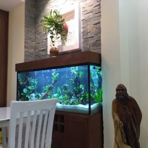 Theo kinh nghiệm thi công, bể cá cảnh nên có kích thước rộng khoảng 1,2m, cao khoảng 0,8m là vừa phải.