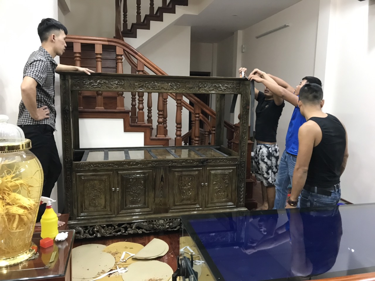 Bể cá rồng của nhà anh Tú ở Long Biên Hà Nội với kích thước dài gần 2m (1m98) rộng 61cm và cao 1m68 đây là số đo phong thủy của chủ nhân bể cá, với chất liệu gỗ mun trạm trổ rồng phượng công phu tỉ mỉ.