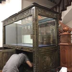 Các đại gia khi xưa thì chơi sập gụ tủ chè, ngày nay bể cá trạm trổ long chầu hổ phục, Cá rồng được coi là một loài cá quý tộc trong dòng cá cảnh, cũng bởi vậy dòng dõi quỹ tộc thì cũng phải ở trong hoàng cung, chiếc bể cá nhà anh Tú chính là hoàng cung của những chú cá với thiết kế cổ điển tỉ mỉ nhưng không kém đi phần sang trọng hiện đại.
