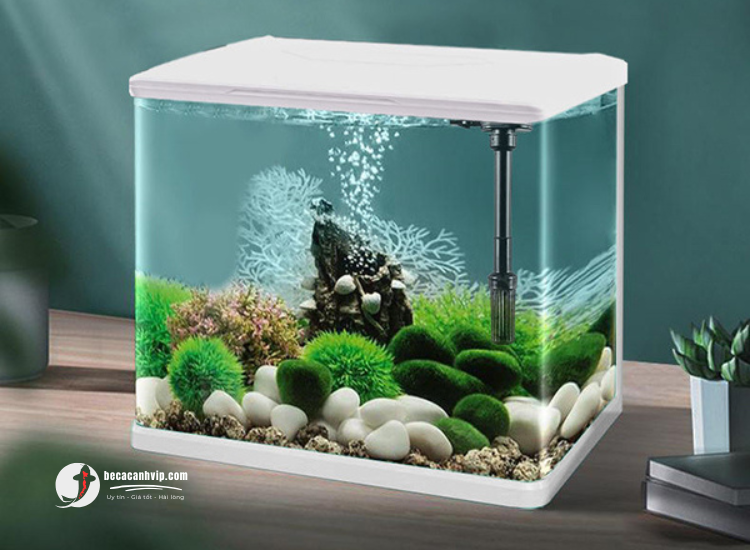 Bể cá cảnh mini để bàn: Thiết kế gọn gàng, phù hợp kích thước bàn làm việc.